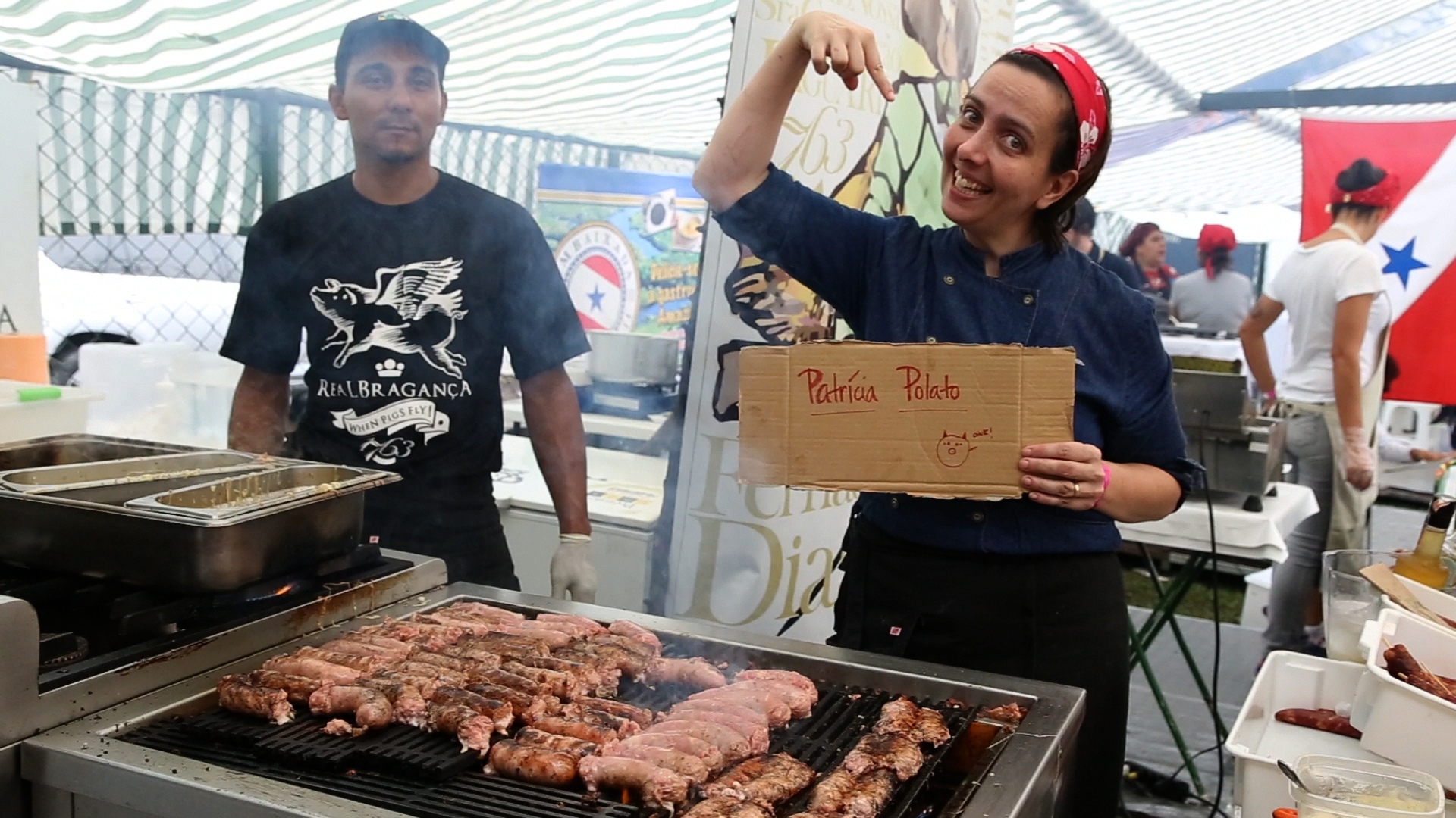 Um dos meus preferidos foi o sanduíche da Patrícia Polato, da Linguiçaria Real Bragança. O mais legal é que ela fica na chapa o dia inteiro, fazendo cada um desses lanches incríveis (linguiça artesanal, creme de alho e 3 queijos no pão francês).