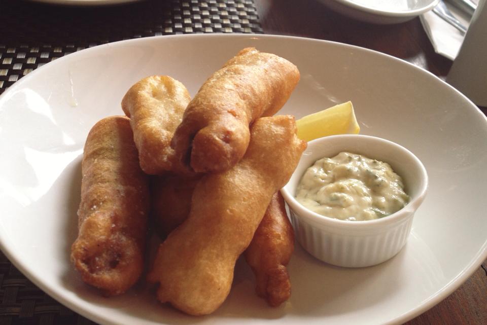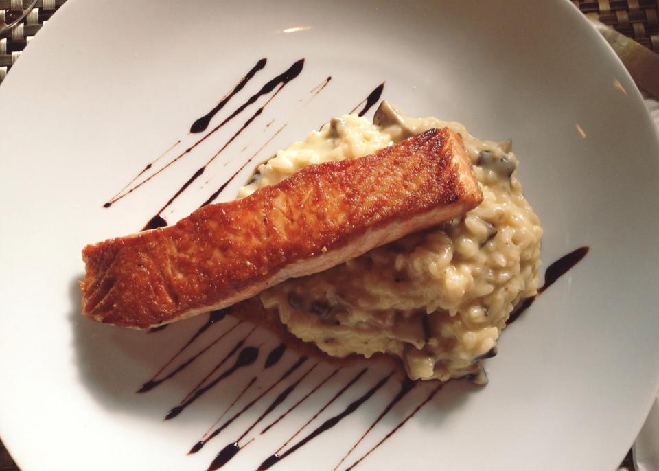 De entrada eu pedi os Fish Fingers com Molho Tártaro e fui de prato do dia: Salmão com Risoto de Cogumelos.