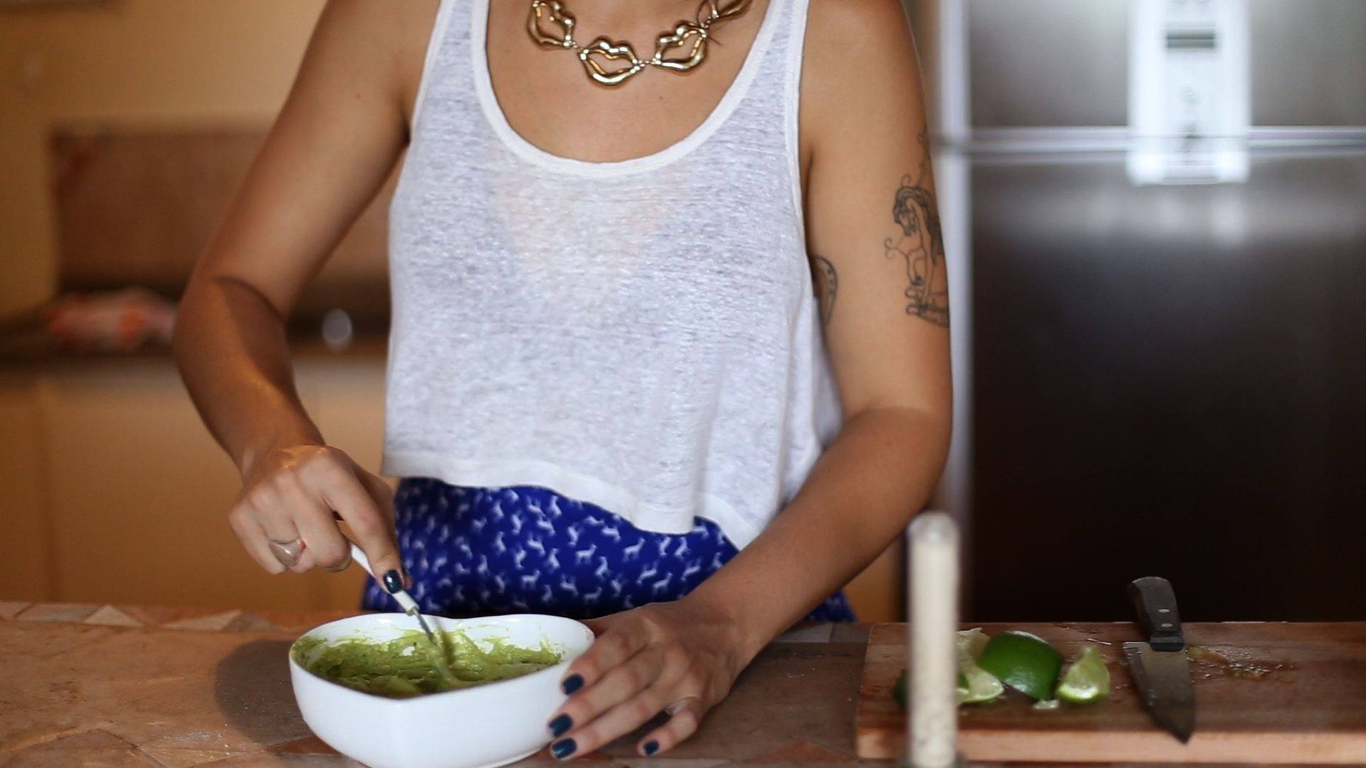 Primeiro a pastinha de avocado: Corte o avocado passando a faca no sentido do comprimento. Abra e tire a semente com a ajuda de uma faca ( te explico melhor no vídeo).Depois é só tirar o “recheio” e misturar com o suco de um limão, sal, coentro,a pimenta e pronto!