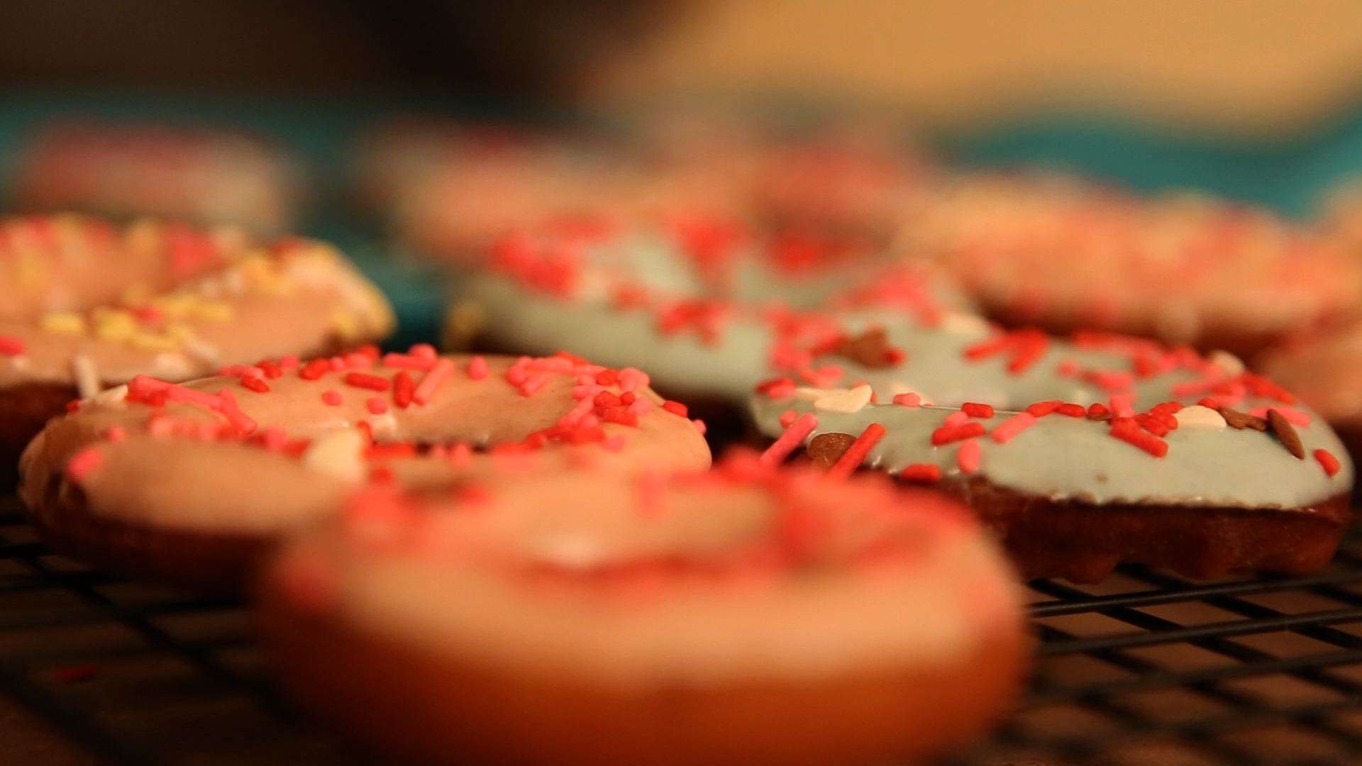 E para a cobertura: chocolate branco derretido + corante + granulados bem coloridos.