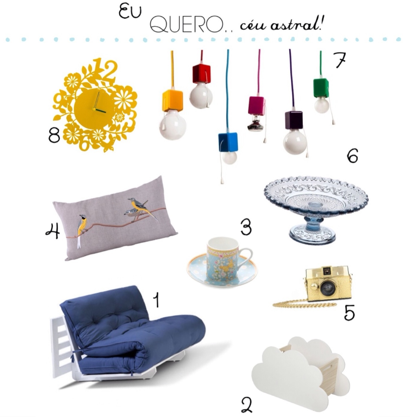 1.Poltrona-Cama Liberdade Branca Com Futon Azul – R$:1.399,00 – Oppa 2. Anjo Baú – R$: 399,00 – Tok&Stok 3. Conjunto de 4 xícaras para café em Porcelana Enchante Jacqueline – R$:199,00 – Spicy 4. Almofada Bem-Te-Vi com Enchimento – R$: 198,00 – Decor8 5. Câmera Lomo Diana Baby 110 Gold Edition + Lente Diana Baby 12mm Gold – R$:167,30 – Marinho 6. Prato com Pé Art-Deco 16cm Azul – R$: 62,00 – Decor8 7. Luminária Nua 5x5x7 Várias Cores – R$: 152,00 – Decor8 8. Relógio de Parede Primavera Amarelo Studio BDA – R$: 78,90 – Boutique de Achados.