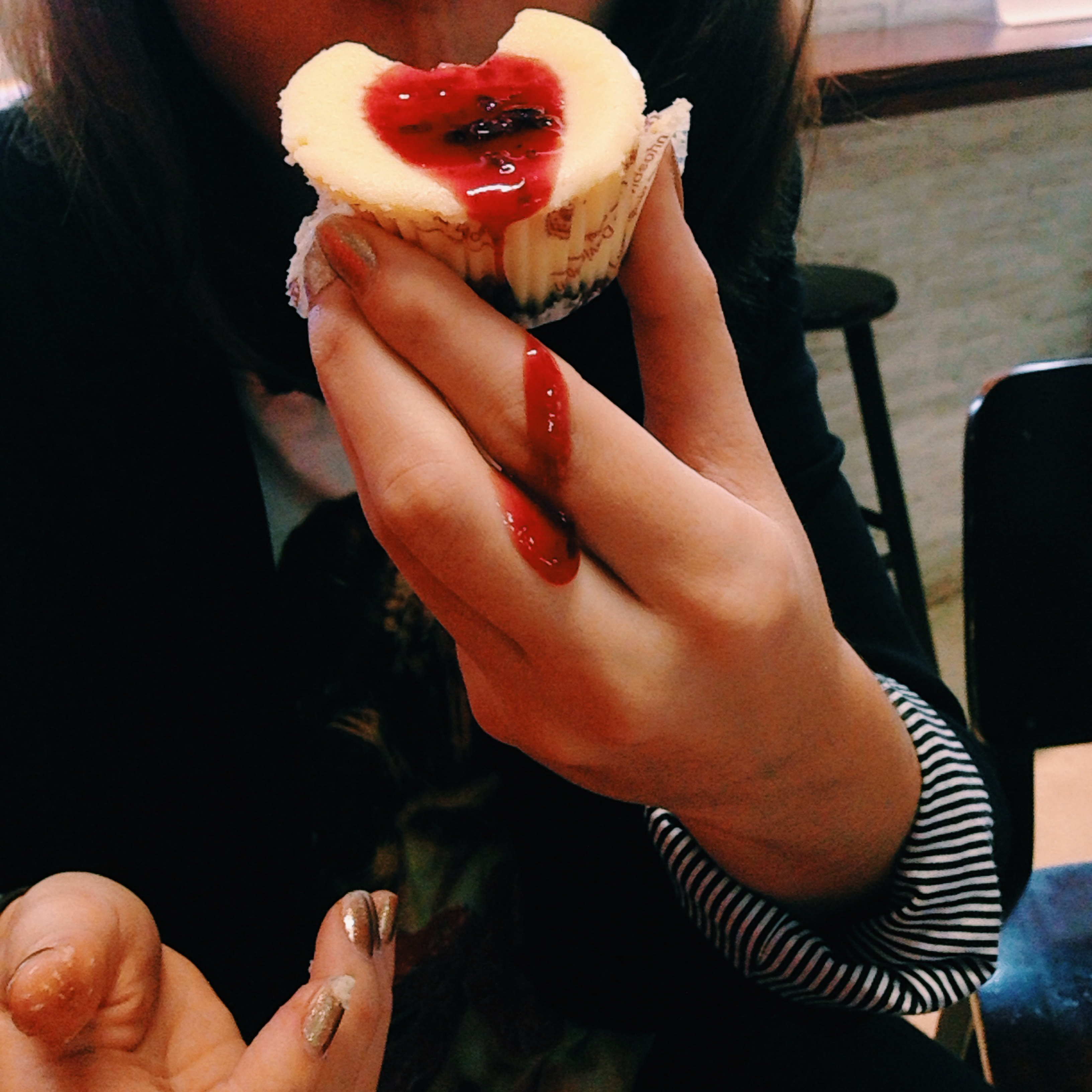 -16(Ops, acho que fiz meleca! Mas tudo bem, valeu a pena! Esse mini cheesecake é tão delicado que chega a parecer uma nuvem docinha, por cima tem calda de frutas vermelhas).