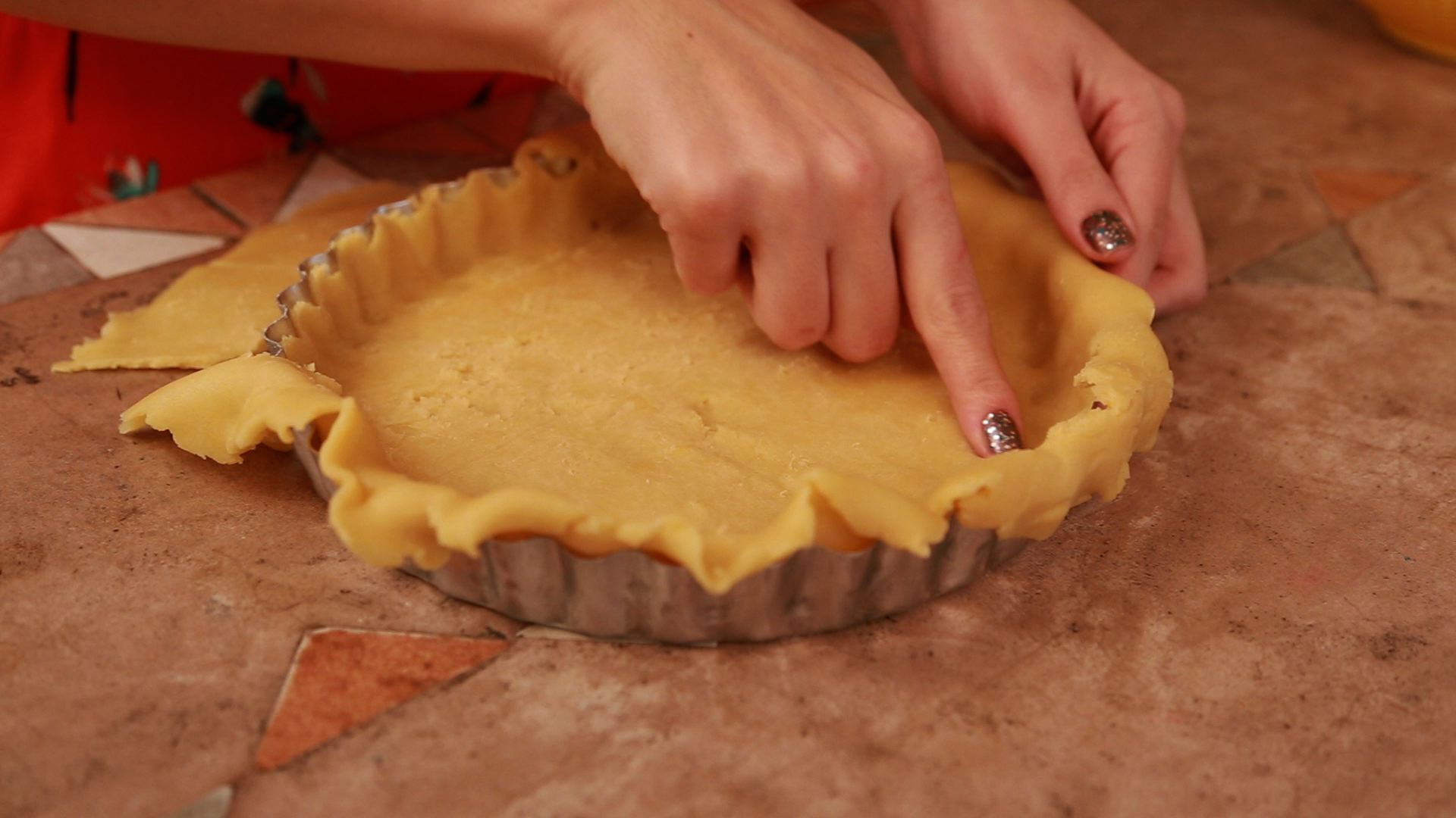 Gelou? Então hora de abrir a massa – entre duas folhas de papel manteiga. Use um rolo e abra delicadamente. Passe a massa para uma assadeira com fundo removível (fundo falso) de maios ou menos 25 cm de diâmetro. Ajeite bem a massa nas laterais, com um garfo faça furinhos (para não “inflar” na hora de assar).