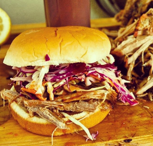 Aka; sanduíche de pulled pork assado e defumado lentamente, com molhinho BBQ e salada coleslaw com maçã verde no pão de cenoura.
