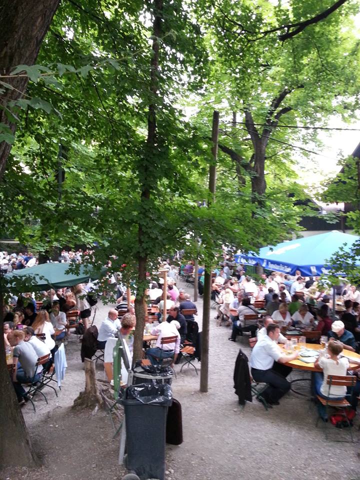 Imagine um lugar grande, lotado com aquelas mesas comunitárias de piquenique. Várias pessoas sentadas, outras de pé e todas com algo em comum: um copo gigante de 1L de cerveja na mão! Sim, esse é o espírito do restaurante ao ar livre Augustiner-Keller, em München, Alemanha.