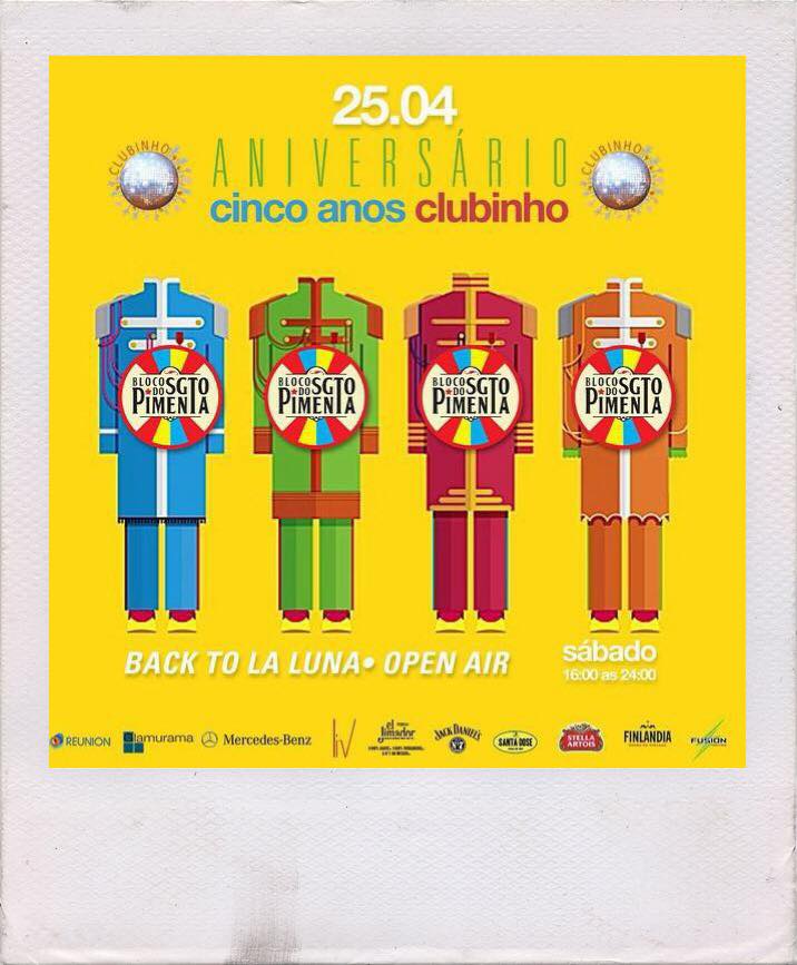 O label CLUBINHO vai comemorar 5 anos! E nessa edição comemorativa, nada MAIS INCRÍVEL do que a presença do maravilhoso Bloco Sargento Pimenta {AMO}! E vai ter também discotecagem de Johnnie Pinton, City Sounds, Thomas Bassetto e Ronaldo Gasparian.
