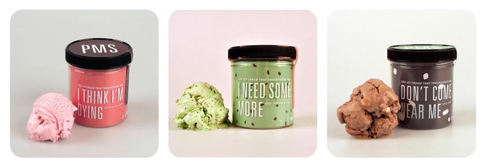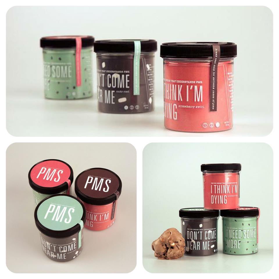 Pensando na sofrência de mulheres como eu {como você}, a estudante de design americana Parker Jones, que tem 21 anos, criou uma marca de sorvetes ~infelizmente fictícia – pelo menos por enquanto~ nomeada “PMS”, que significa TPM em inglês.