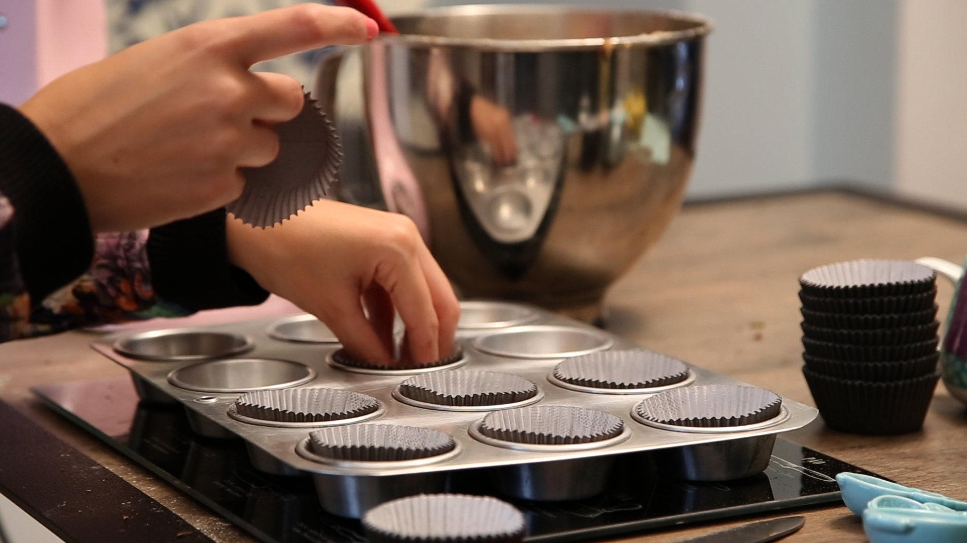 Antes de começar, separar todos os ingredientes, picar o chocolate e deixar o forno pré-aquecido a 180 graus. Já coloque as forminhas de papel na forma de alumínio para cupcake – não precisa untar nada.