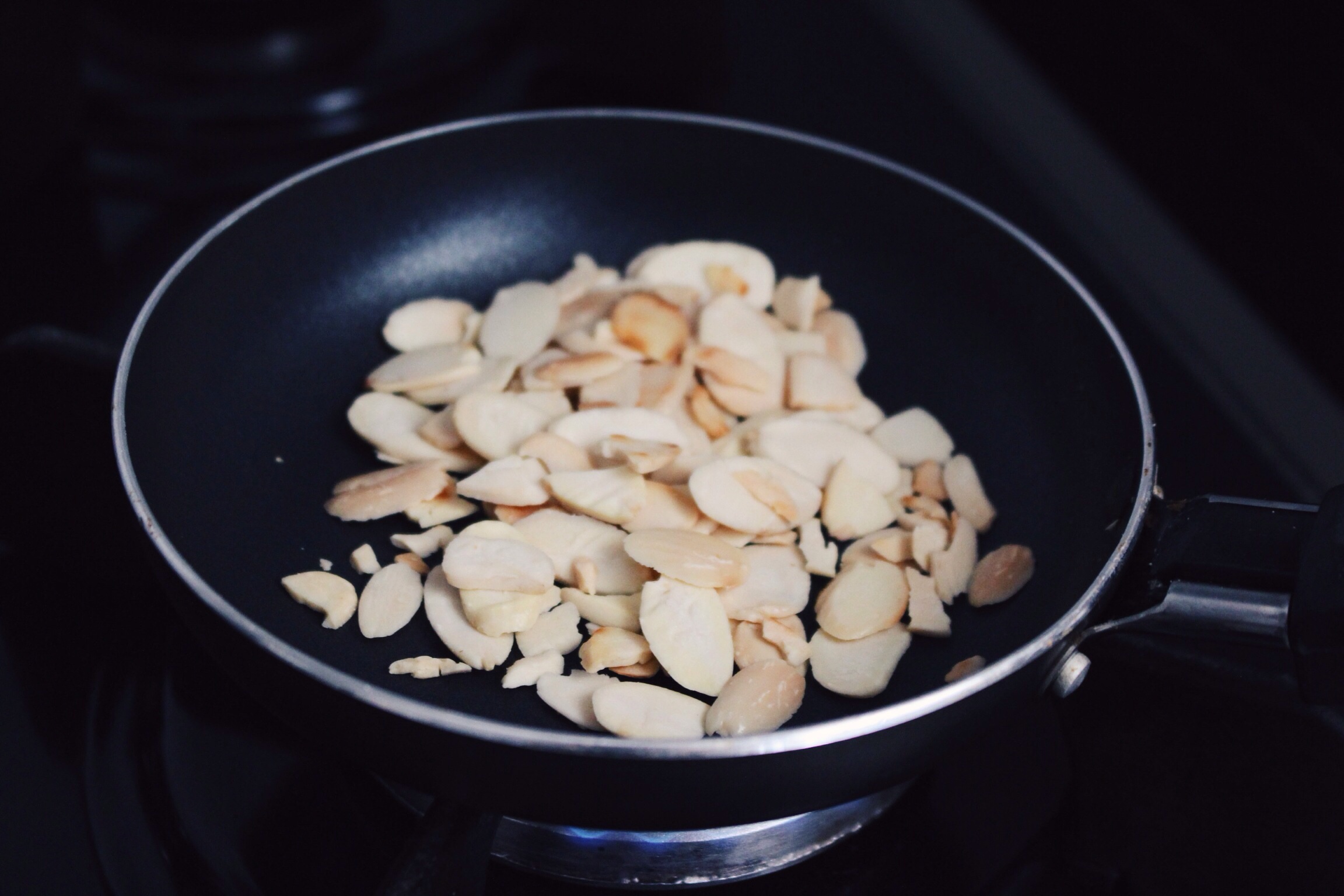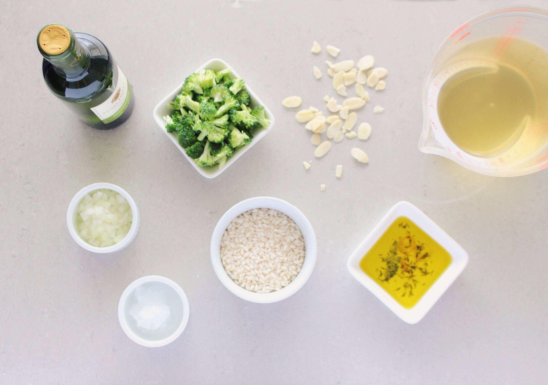 Quando o arroz estiver al-dente (talvez não será necessário usar todo o fundo), tire do fogo, junte as amêndoas já tostadas, o brócolis cozido, a “manteiga” de azeite e acerte o sal e apimenta.