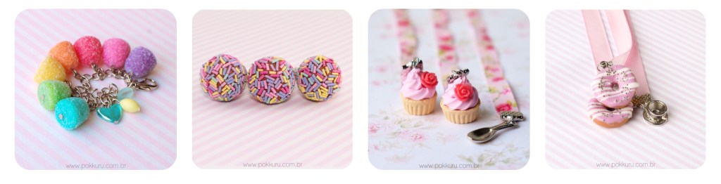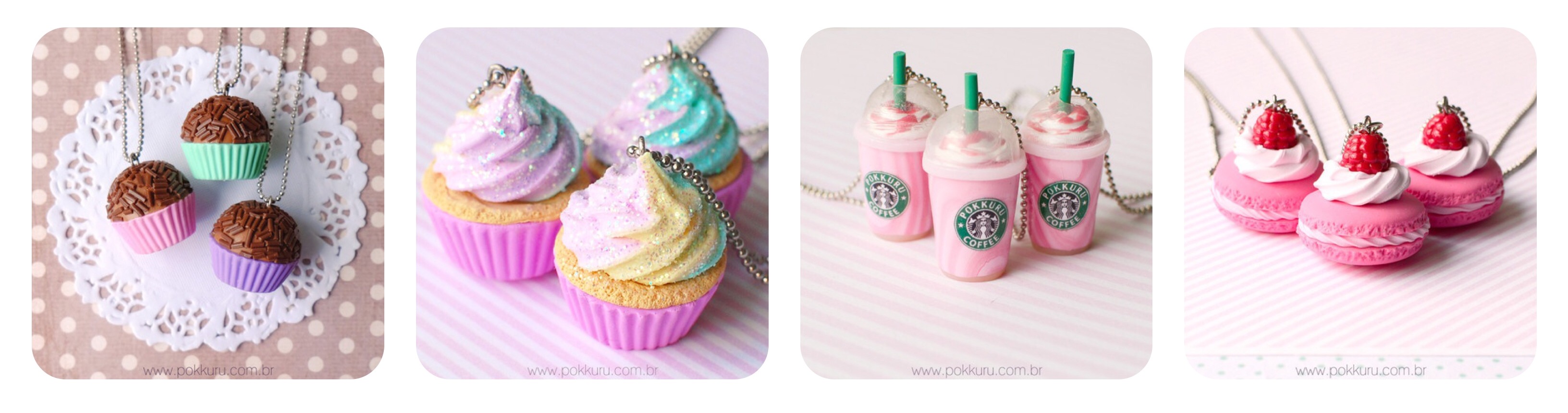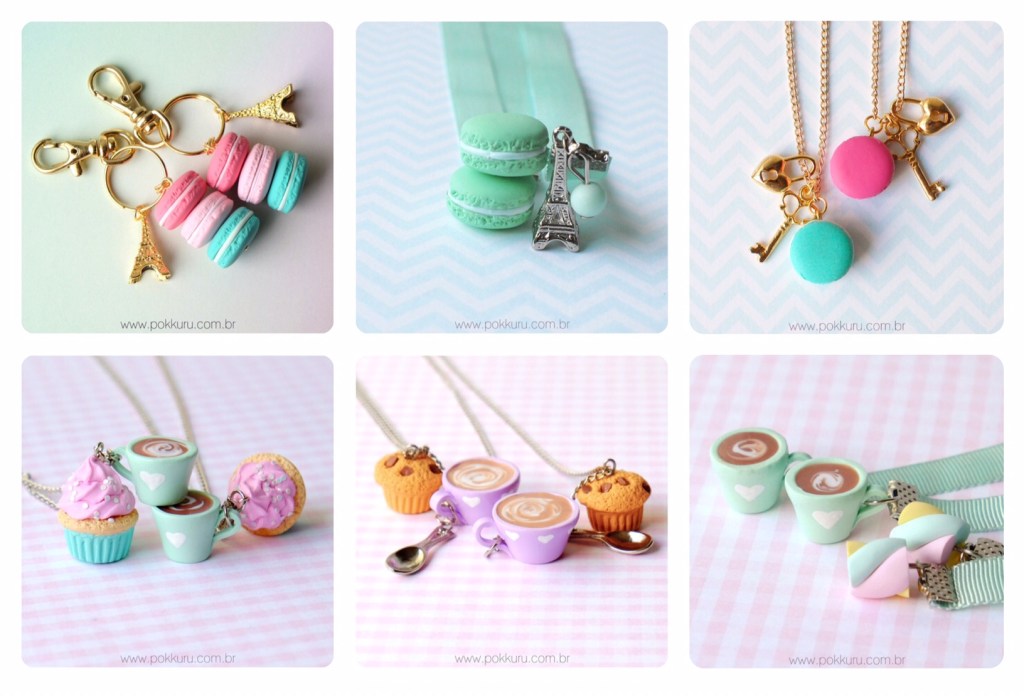 Tem colar com pingente de sorvete, chaveiro de macarons, marcador de página de marshmallow, pulseira de jujuba, anel de brigadeiro gourmet… uma explosão de fofura! Tudo tão lúdico!
