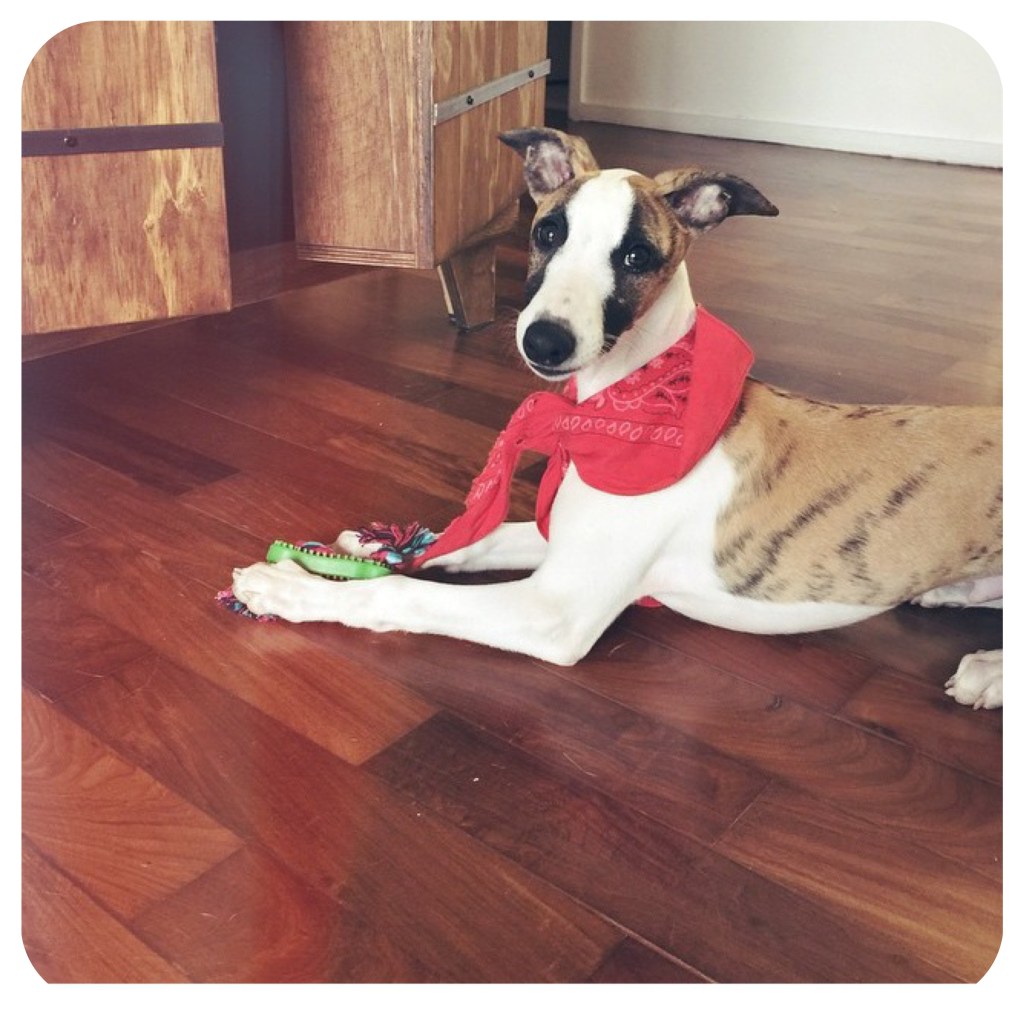A raça dele é Whippet, aquela mesmo, dos cachorrinhos de corrida. Eles são compridos, tem patas e focinho longos. E apesar de ainda ser um bebê, ele é relativamente grande, mas cabe no colinho (aliás, ele AMA tirar cochilo em um colo quentinho).