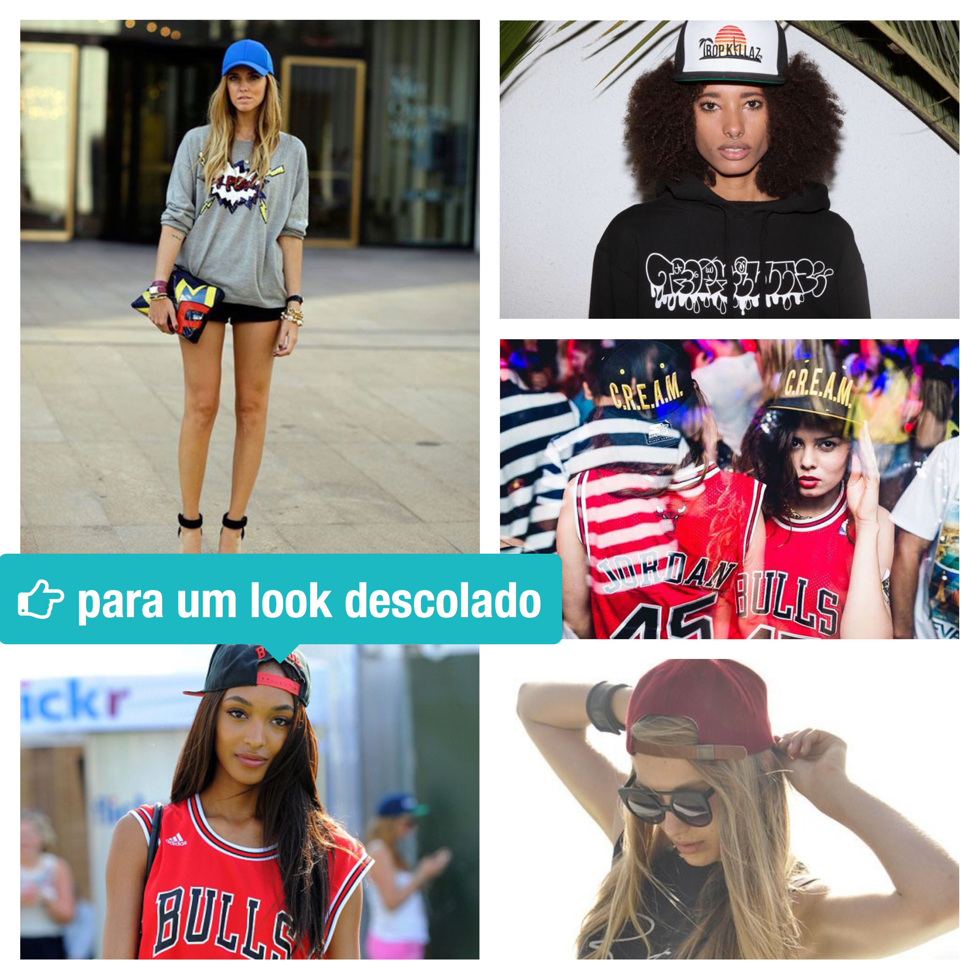 Além de ser super feminino SIM, um boné maneiro pode deixar seu look bem mais descoladinho. Dá pra usar de várias formas, do estilo Sporty Spice até a modernete da balada. É só escolher um modelo bacana, montar um look esperto e PÁ!