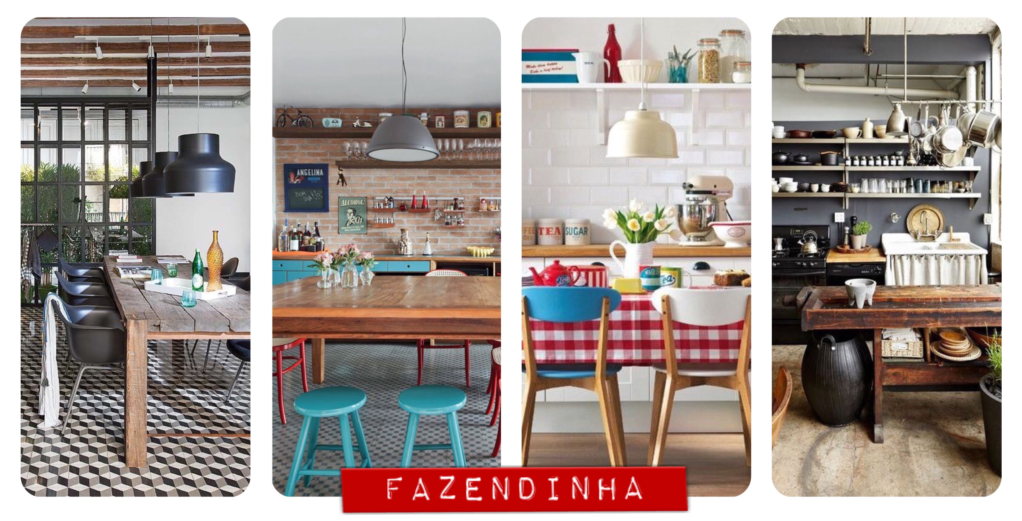Agora se você mora em casa ou tem uma área bem grandona, com certeza minha sugestão seria uma cozinha com cara de fazenda! Mesa grande no meio, móveis de madeira, decoração bem rústica (mas com nosso toque de modernidade, né!).