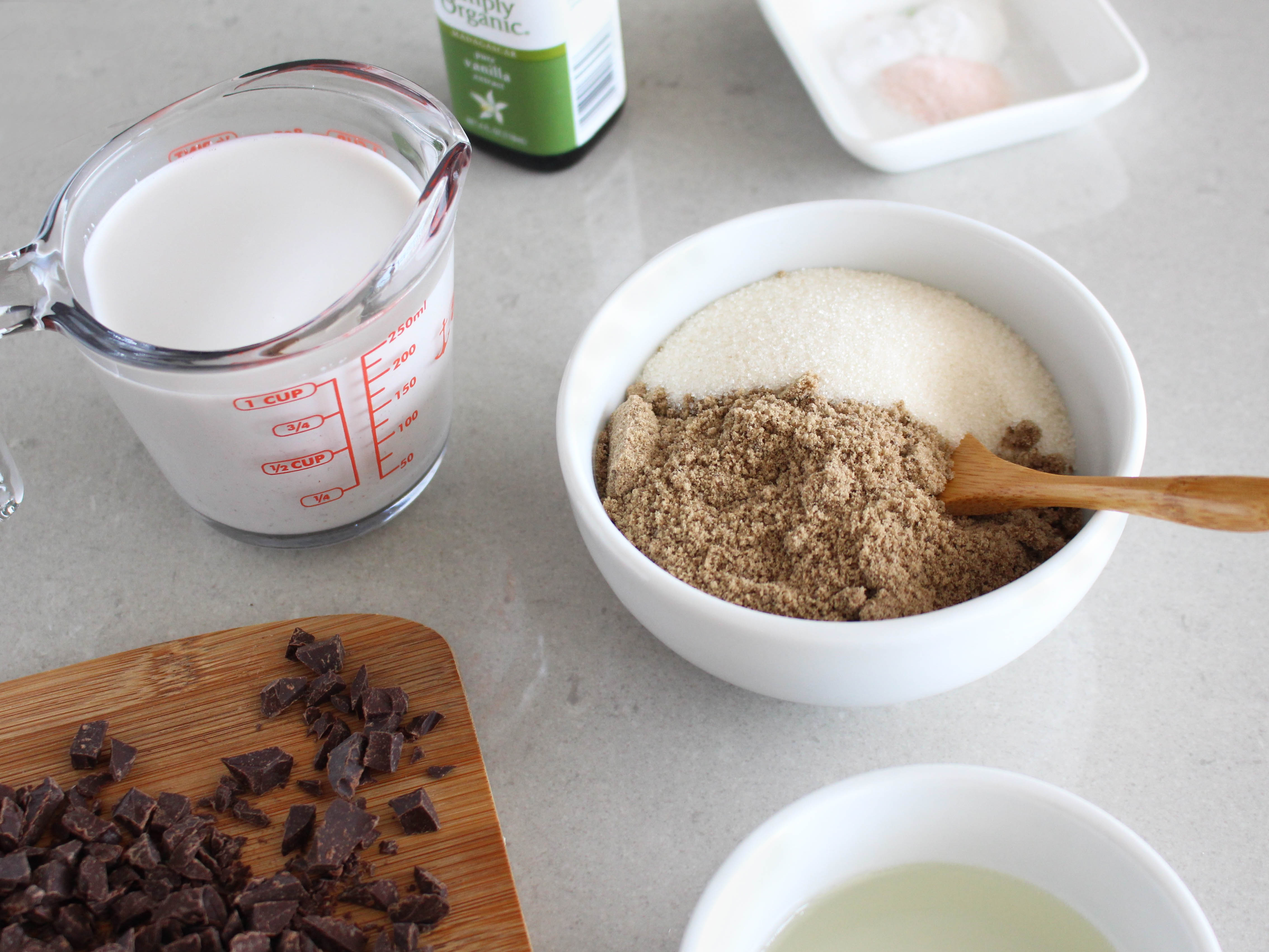 - Em uma batedeira, bata o óleo de coco com os dois açúcares e a baunilha para iniciar a dissolução do açúcar.
