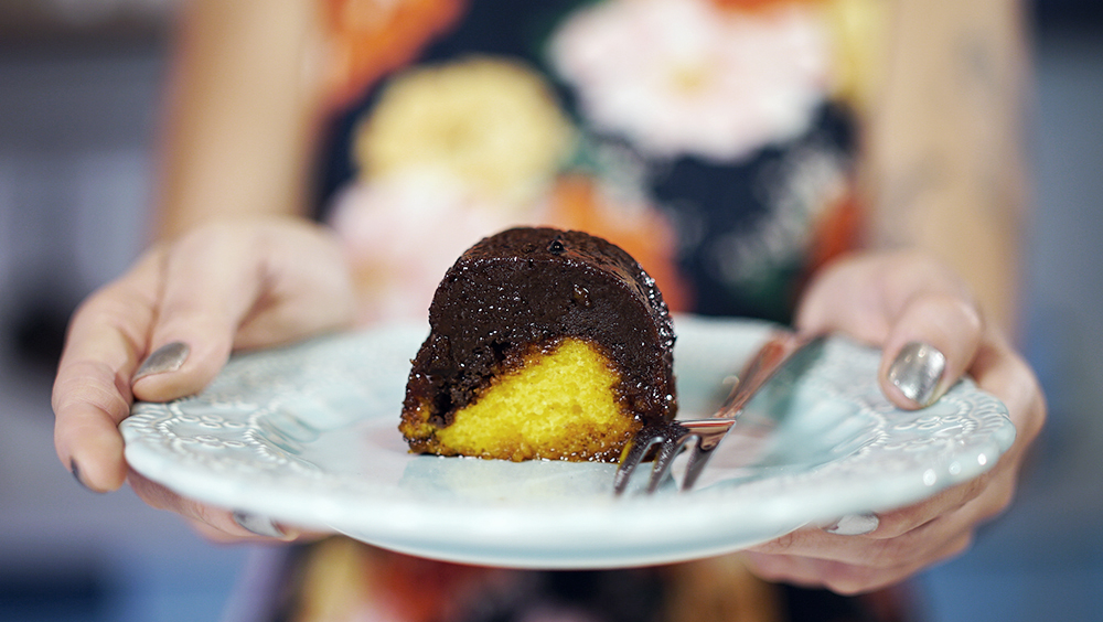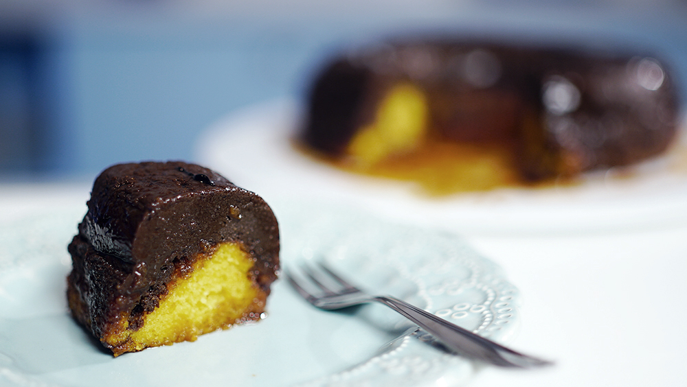 Sabe aquelas receitas MALUCAS que a gente pensa que não vai dar certo? Essa deu! Por cima Pudim de Chocolate, e por baixo Bolo de Cenoura!