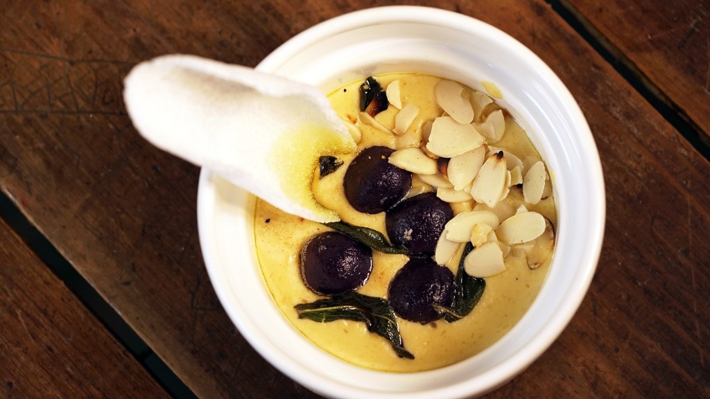 Além do pão de queijo in-crí-vel o restaurante conta também com um cardápio cheio de brasilidade e pratos de dar água na boca, como o nhoque de batata doce roxa acompanhado por creme de requeijão de corte e tapioca crocante, uma entrada pra lá de deliciosa que aprendi a fazer com a chef Manuelle e sua equipe formada apenas por mulheres.