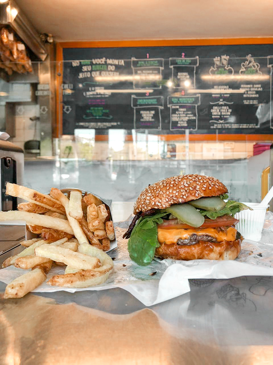 Os burgers ficam na média dos 30 reais, a batata com pastrami sai por R$28 e os drinks R$25.