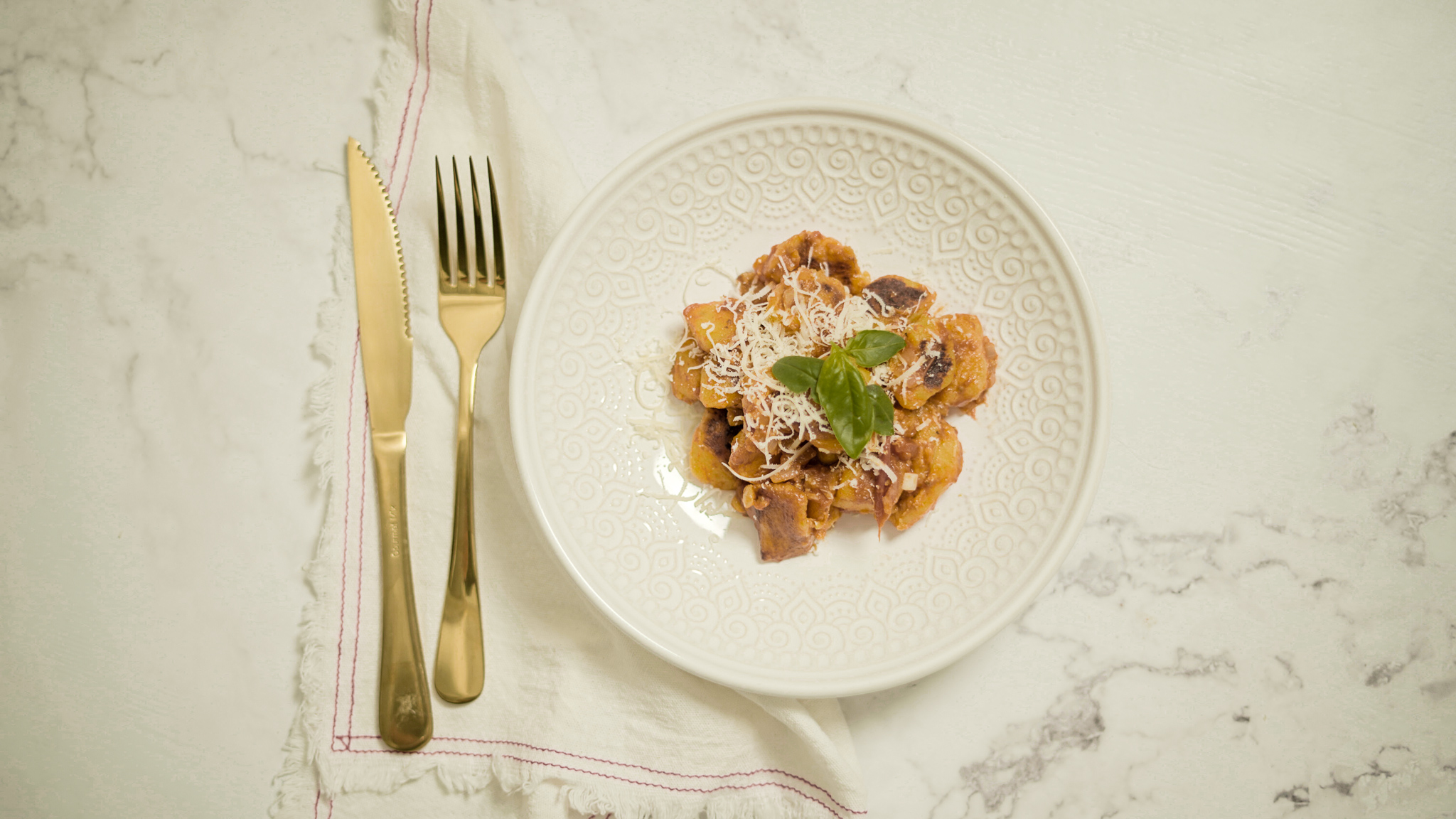 Pra fazer esse nhoque eu usei mandioquinha (ou batata baroa), e fica super super saboroso! Além de mudar o ingrediente principal, tem um segredinho especial que faz o prato ficar ainda mais delicioso: ao invés de cozinhar em água fervente, a ideia aqui é selar os nhoquinhos em uma frigideira com azeite, assim eles ficam tostadinhos e mais saborosos.