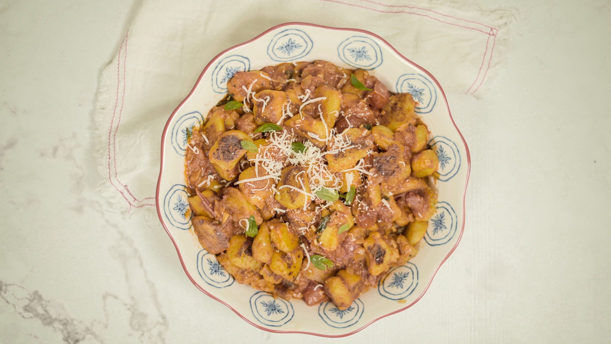 Pra este Nhoque, eu fiz um molho caseirinho de tomate com manjericão, mas você pode cobrir com o molho de sua preferência.