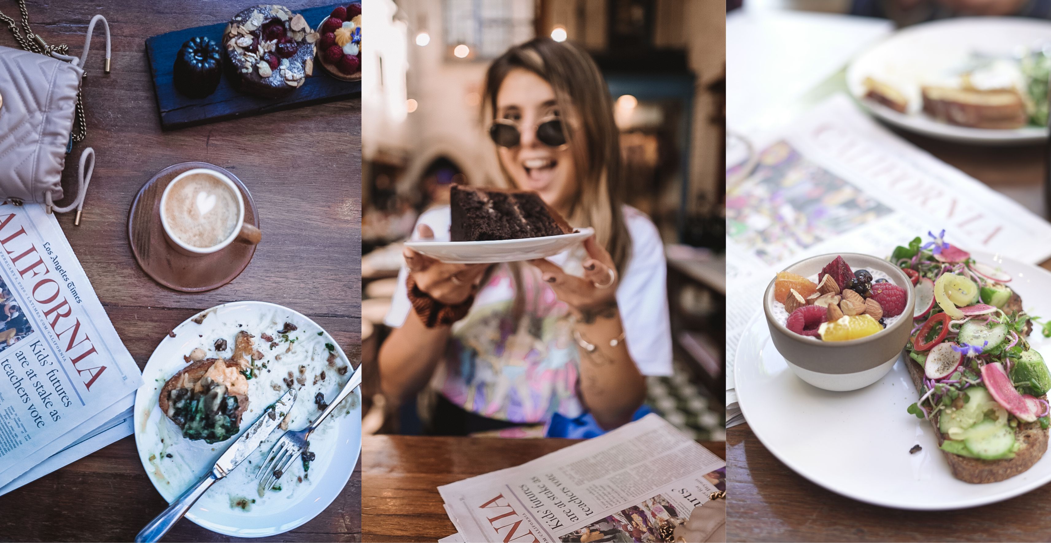 O cardápio é super vasto e tem opções para todos os gostos. Torrada com geléia e pasta de amendoim, shakshuka, toasts, quiches, sanduíches…. Na nossa mesa, pedimos uma toast de cogumelos, com espinafre, creme hollandaise e ovos mexidos, que estava deliciosa. O capuccino era muito gostoso, e não preciso nem falar da super fatia de bolo de chocolate!! Os pratos variam entre 9 e 24 dólares. Mas ó, vai sem converter a moeda, porque afinal quem converte, não se diverte, e deixa de conhecer lugares incríveis como esse. Recomendo o Republique e voltarei todas as vezes que estiver em L.A