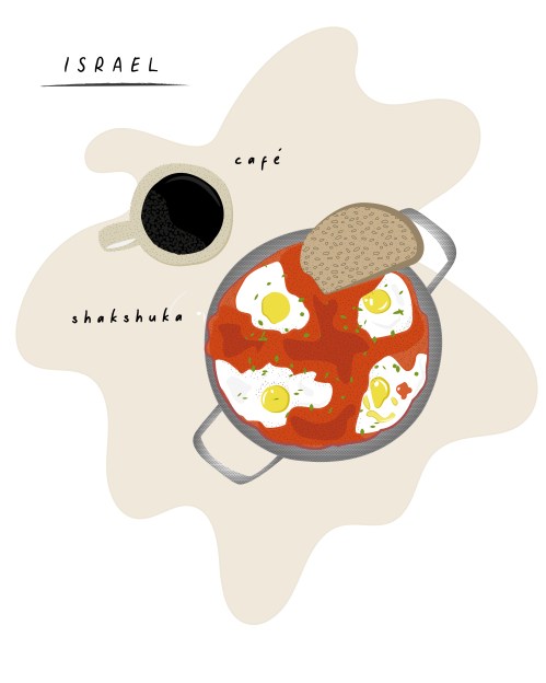 No café da manhã israelense não pode faltar a famosa shakshuka! Que é basicamente um molho de tomate suuuper condimentado, temperado com muitas especiarias e leva ovos cozidos (no próprio molho), o prato é servido bem quente, com challah (um pãozinho fofo e delicioso) acompanhado de um bom café preto!